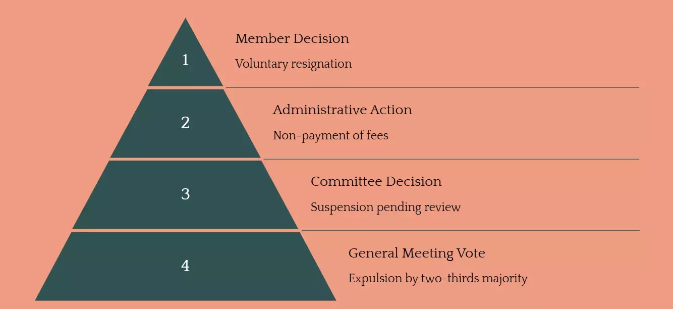 Members facing potential expulsion have the right to address the General Meeting before any final decision is made. Note that resigned or expelled members are not entitled to refunds of any fees or contributions.